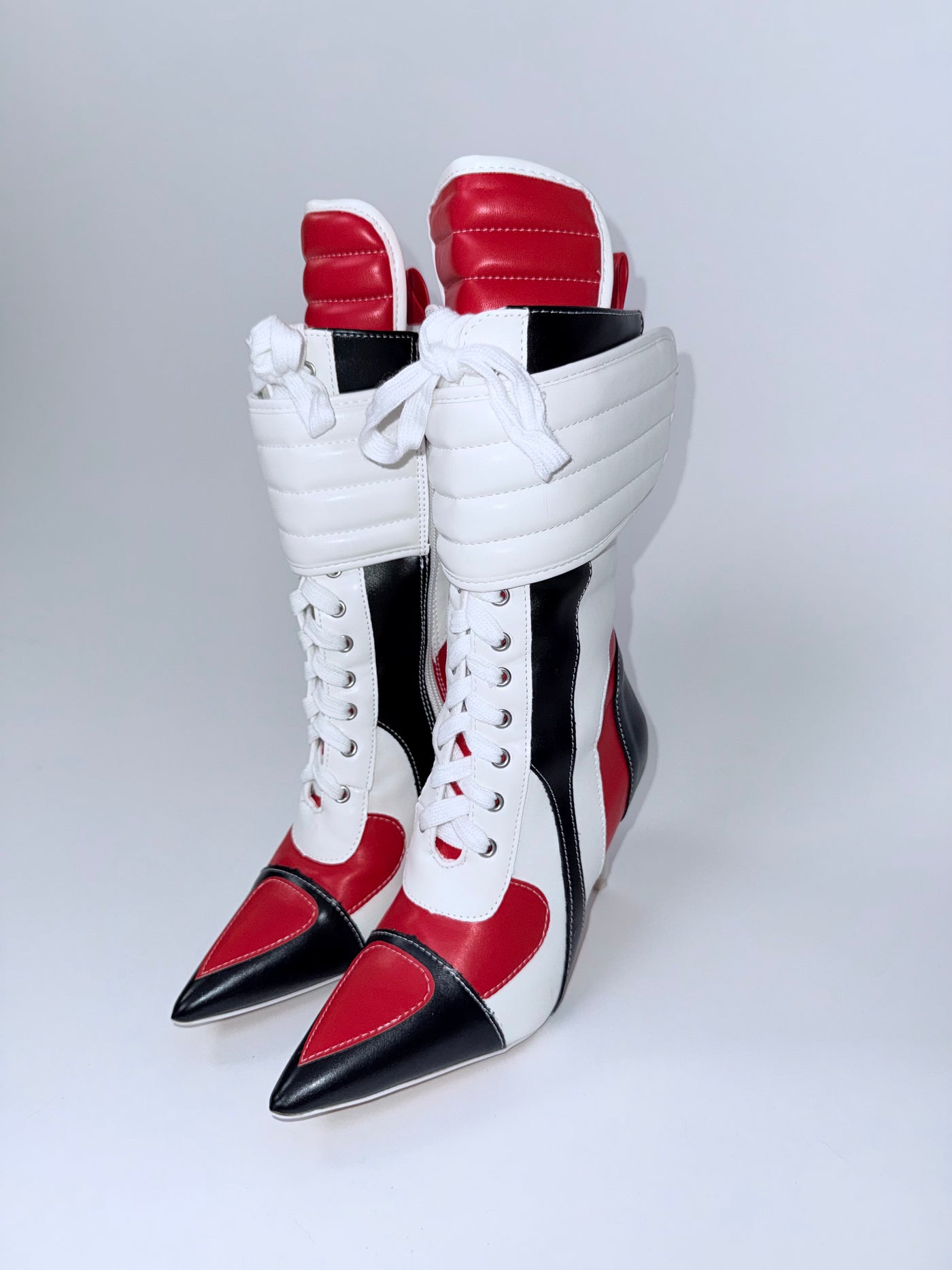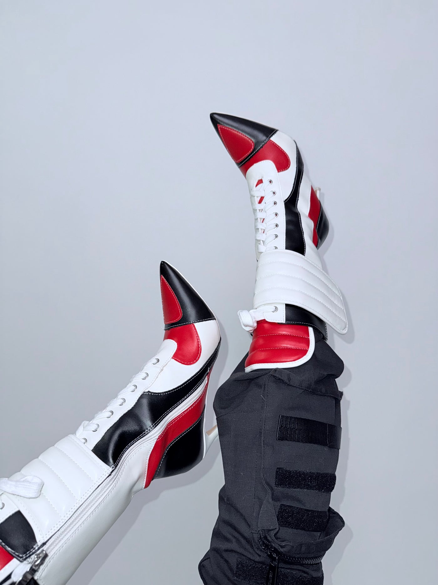 These racer-inspired stiletto boots combine sporty detailing with high-fashion structure. The pointed toe creates a sharp silhouette, while the color blocking adds visual impact that stands out in photos, content shoots, and night-out styling.